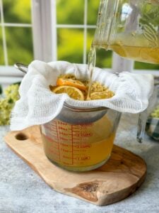 After a couple days of soaking, it’s time to strain the finished elderflower cordial! To do so, I like to line a fine-mesh strainer with cheesecloth for extra filtration. Using cheesecloth also makes it easier to squeeze out every last drop of syrup.